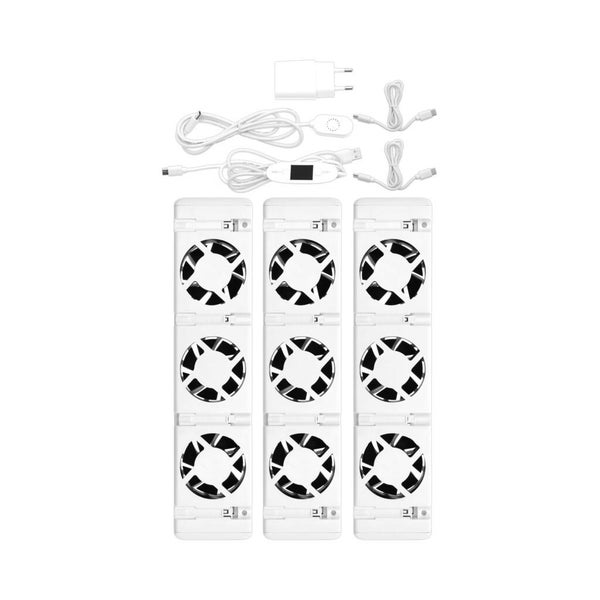 • Inhaltet drei Heizkörperlüfter, zwei Anschlusskabel, ein Thermostat, Adapter, Temperaturfühler und Anleitung