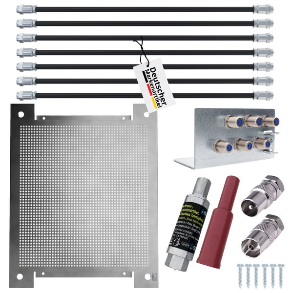 Lochblech Montageplatte Set für Kabel TV Antennenverstärker, Sat- / Kabel Verteiler inkl. F-Stecker Koaxialkabel Patchkabel, Kabelfernsehen Überspannungschutz, Erdungsblock, 6 Teilnehmer