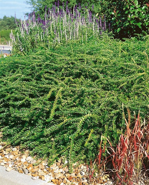 Lonicera nitida ‘Elegant’, die Immergrüne Heckenkirsche, präsentiert sich als feingliedriger, dicht verzweigter Zierstrauch mit elegant glänzendem, kleinblättrigem Laub in frischem Grün. Der botanische Gartenstrauch zeigt im späten Frühjahr zarte, cremeweiße Blüten, die dezent duften und den buschigen Wuchs unterstreichen, gefolgt von unscheinbaren Früchten. Dank seines kompakten, gut verzweigenden Aufbaus und der hohen Schnittverträglichkeit eignet sich dieser immergrüne Blütenstrauch hervorragend als niedrige Heckenpflanze, Einfassung, Formschnittgehölz und Buchsbaum-Ersatz. Ob im Vorgarten, als Strukturgeber im Staudenbeet, als Solitär im kleinen Garten oder als Kübelpflanze auf Terrasse und Balkon – ‘Elegant’ setzt ganzjährig ordentliche, ruhige Akzente und sorgt für klare Linien in Gruppenpflanzungen ebenso wie in strengen Formhecken.
