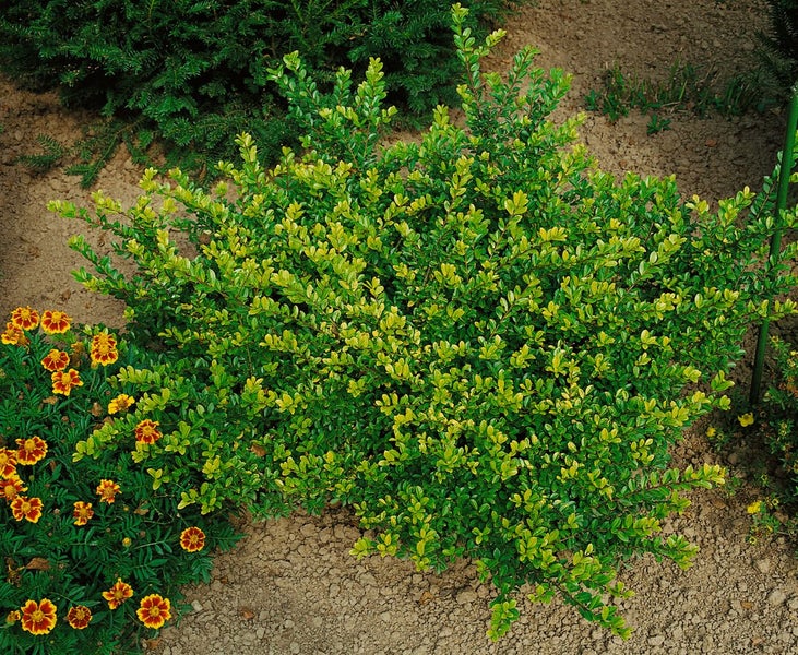 Lonicera nitida ‘Maigrün’, die Heckenmyrte ‘Maigrün’, ist ein immergrüner Zierstrauch mit feinem, dichtem Laub und auffallend frischgrünen Trieben, die dem Garten ganzjährig Struktur geben. Die kleinen, glänzenden, ovalen Blätter stehen eng an den Trieben und bilden eine kompakte, buschige Wuchsform, die sich hervorragend für niedrige Hecken, Beeteinfassungen und präzisen Formschnitt eignet. Im Frühjahr, etwa von April bis Juni, erscheinen zarte, cremeweiße Blüten, die dezent wirken und den Blütenstrauch unaufdringlich abrunden; im Herbst können sich vereinzelt purpur-schwarze Beeren zeigen. ‘Maigrün’ wächst dicht verzweigt und mittelstark, erreicht je nach Schnitt zwischen 60 und 120 cm Höhe und bleibt schön formstabil, was sie als Heckenpflanze, Gartenstrauch, Bodendecker oder Solitär im Vorgarten prädestiniert. Auch im Kübel auf Terrasse und Balkon zeigt sich die Heckenmyrte als pflegeleichte Kübelpflanze mit elegantem, immergrünem Charakter. Bevorzugt werden sonnige bis halbschattige Plätze, doch die Sorte ist erstaunlich schattentolerant und hält städtischen Bedingungen gut stand. Der Boden sollte durchlässig, humos und gleichmäßig frisch sein; kurzzeitige Trockenheit wird nach der Etablierung gut vertragen, Staunässe ist zu vermeiden. Ein bis zwei Formschnitte pro Saison fördern die Dichte und erhalten klare Kanten, sei es als kleine Hecke, Figur im Formschnitt oder flächige Gruppenpflanzung. Winterhart und windverträglich bietet Lonicera nitida ‘Maigrün’ ganzjährig Farbe, feintexturierte Blätter und verlässliche Struktur für Beet, Terrasse und Vorgarten.