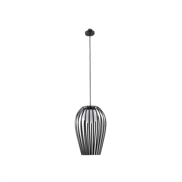 Die Außenpendelleuchte Marrin besteht aus schwarzem Metall und weißem Kunststoff. Sie kann mit E27