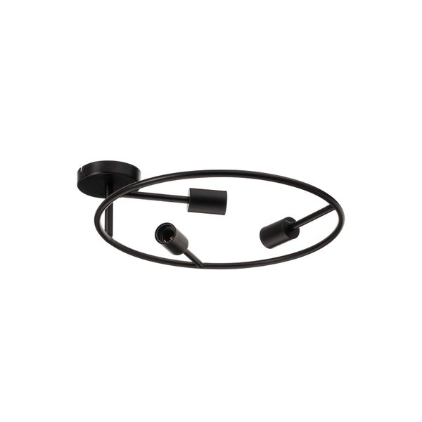 Deckenleuchte aus Eisen. Sie präsentiert sich in schwarzer Farbgebung und kann mit entsprechenden Leuchtmitteln bestückt werden. Darüber hinaus überzeugt sie mit einer kreisrunden Optik, die vom Designer Ingo Thiele stammt.