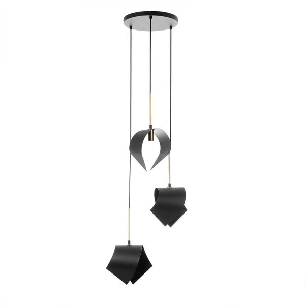 Hängeleuchte; die aus Stahl hergestellt ist und sich in Sandschwarz präsentiert. Sie besitzt darüber hinaus drei Leuchtenschirme, die mit entsprechenden Leuchtmitteln bestückt werden können. Der Entwurf der Leuchte entstammt den kreativen Fingern von Ingo Thiele.