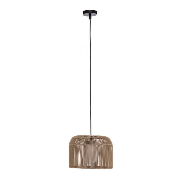 Die Hängeleuchte Solvindor ist für Innen und Außen geeignet. Sie hat einen Lampenschirm aus Kunststoff in khaki und kann mit E27
