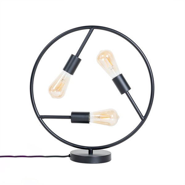 Tischleuchte aus Eisen. Sie präsentiert sich in schwarzer Farbgebung und kann mit entsprechenden Leuchtmitteln bestückt werden. Darüber hinaus überzeugt sie mit einer kreisrunden Optik, die vom Designer Ingo Thiele stammt.