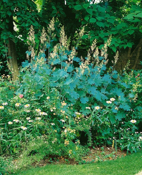 Am liebsten wächst der Federmohn sonnig bis halbschattig auf durchlässigen, nährstoffreichen, eher frischen Böden ohne Staunässe; leichte Kalkverträglichkeit und zeitweilige Trockenheit nach guter Etablierung werden gut toleriert. Ein bodennaher Rückschnitt im Spätwinter fördert den vitalen Neuaustrieb, verblühte Rispen können für eine klare Silhouette entfernt oder als dekorative Struktur belassen werden. Da Macleaya ausläuferbildend sein kann, empfiehlt sich in kleinen Gärten eine Wurzelsperre oder regelmäßige Kontrolle der Bestände. In Kombination mit Ziergräsern, hohen Sonnenhüten und filigranen Stauden entsteht ein harmonisches, langlebiges Bild, das durch das feine Spiel der Blätter und die schwebenden Blütenrispen eine außergewöhnliche Tiefe in Beet, Vorgarten und großzügigen Anlagen erzeugt.