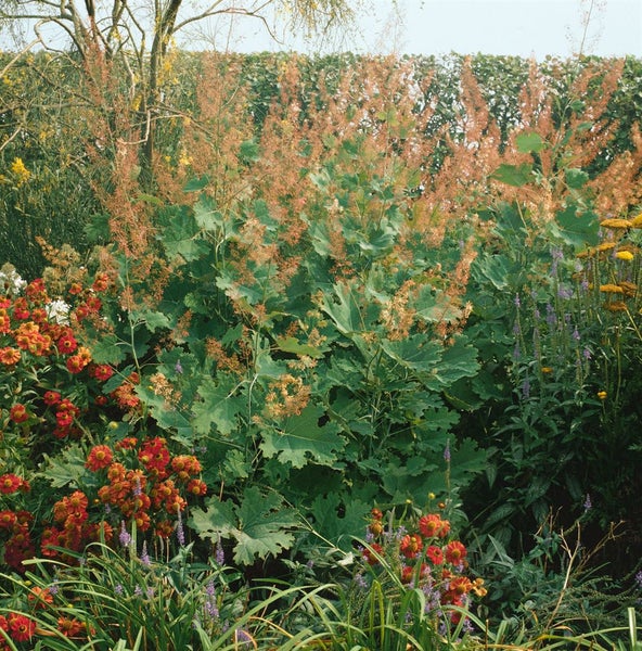 Macleaya microcarpa ‘Kelway’s Coral Plume’, der Großfrüchtige Federmohn, überzeugt als imposante Blütenstaude mit architektonischer Wirkung und eleganter Präsenz im Garten. Die Sorte zeigt im Hochsommer luftig-leichte, korallen- bis lachsrosa Feder-Rispen, die über dem markanten, großblattigen Laub schweben. Die tief gelappten, blaugrün bis silbrig bereiften Blätter setzen einen edlen Kontrast und betonen die aufrechte, majestätische Wuchsform. Mit einer Höhe von etwa 180 bis 250 cm und einer stattlichen Breite eignet sich dieser Federmohn hervorragend als Solitär im Staudenbeet, als strukturgebende Hintergrundstaude in gemischten Rabatten oder in großzügigen Präriebeeten und Naturanlagen. Auch in sehr großen Kübeln auf Terrasse oder Patio zeigt sich die robuste Gartenstaude eindrucksvoll, sofern ausreichend Raum und Nährstoffe zur Verfügung stehen. ‘Kelway’s Coral Plume’ bevorzugt sonnige bis halbschattige Standorte mit durchlässigem, nährstoffreichem, frischem bis mäßig trockenem Boden. In windoffenen Lagen empfiehlt sich ein leichter Rückschnitt oder eine unauffällige Stütze, um die hohen Blütenrispen zu schützen. Die Staude ist winterhart, treibt zuverlässig aus dem Rhizom wieder aus und gilt als pflegeleicht; ein Auslichten nach der Blüte fördert die Vitalität. In Gruppenpflanzungen entfaltet sie besondere Wirkung, lässt sich aber ebenso als akzentuierende Strukturpflanze mit Ziergräsern, Sonnenhut oder Helenium kombinieren. Für klare Beetarchitektur im Vorgarten oder als Blickfang am Grundstücksrand ist ‘Kelway’s Coral Plume’ eine ausdrucksstarke Wahl mit lang anhaltendem Zierwert.