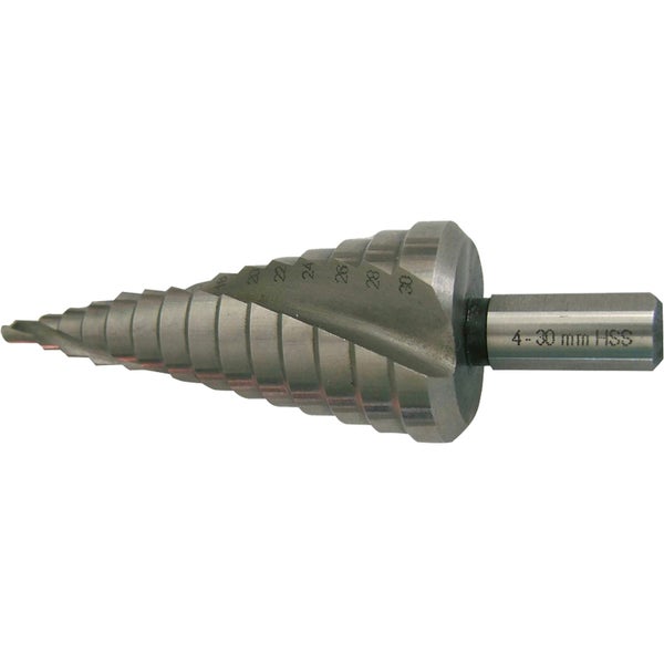 Stufenbohrer HSS-G mit Spiralnut Geeignet für legierte und unlegierte Stähle, Edelstahl, Aluminium, Gusseisen. Stähle < 800 N/mm² Zugfestigkeit.
