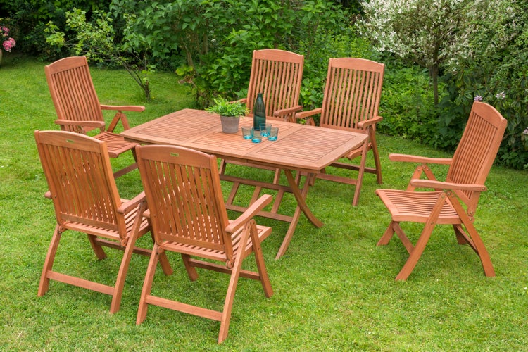 Das Gartenmöbelset Maracaibo ist zeitlos und elegant. Das Set besteht aus 6 Klappsessel, die Rückenlehne lässt sich zum Entspannen 5-fach verstellen. Die Rücken- und Sitzflächen der Sessel sind für einen hohen Sitzkomfort ergonomisch geformt. Maracaibo ist eine sehr wertige Serie und überzeugt durch die geschwungenen Längslatten in den Rückenflächen. Der praktische Klappausziehtisch hat die Grundmaße 100 x 90 cm und lässt sich bei Bedarf auf eine Länge von 160 cm ausziehen.