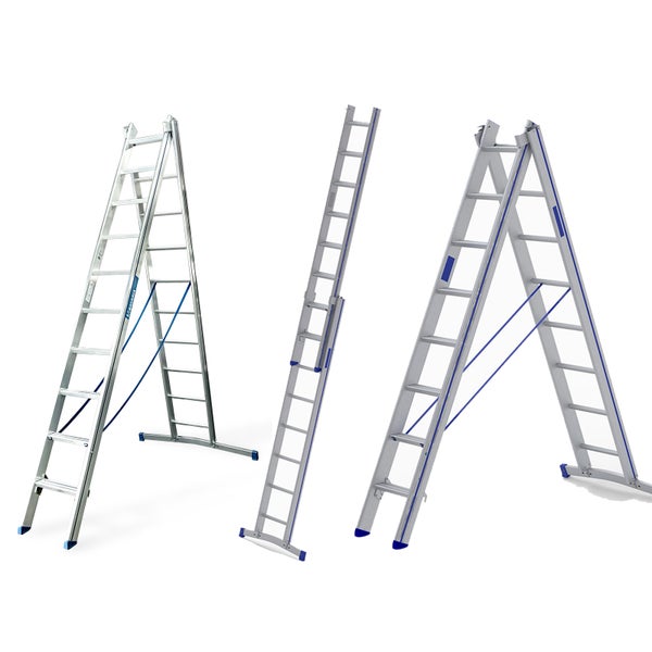 Mit der neuen Hybrid-Leiter sind Sie auch ohne Trittpodest auf der sicheren Seite: Sie arbeiten konform zur TRBS 2121-2 sowie zu den hohen Anforderungen der DIN EN 131-1 und -2 für beruflichen Gebrauch. Besonders robust, ist dieser Leiterntyp ideal für die raue Baustellenumgebung. zweiteilige Hybrid-Leiter: Stehleiter, Anlegeleiter und Schiebeleiter in einem 80mm Stufen auf dem einen, 40mm Sprossen auf dem anderen Leiternschenkel der Stehleiter Schiebeleiter mit Stufen im oberen Leiternteil, sodass auf Stufen stehend gearbeitet werden kann bequem und sicher Arbeiten: Stufen im oberen Teil der Schiebeleiter formschöner, ergonomisch geformter 100mm-Ovalholm für angenehmen Griff bei Aufstieg und Transport Sicherheits-Keilfüße: rutschhemmend und kabelschonend Stufen/Sprossen und Holme aus hochfesten Strangpressprofilen (T 66) reparaturfähig: verschraubte Stufen/Sprossen einzeln tauschen gebogene Traverse zum Ausgleich kleiner Unebenheiten integrierte Spreizsicherung Deutsche Handwerksqualität - made in Germany
