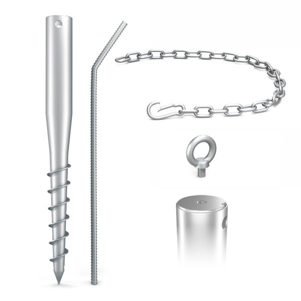 - Im Lieferumfang enthalten4 x Core Schraubfundament 60 cm; 1 x Eindrehstange; 4 x Ringöse M12; 4 x Kette (ca. 40 cm); 4 x Karabinerhaken