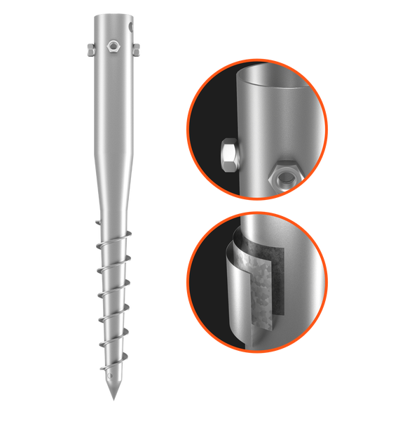 Unser Core 4 Schraubfundament ist ideal zum Errichten von Zäunen, Sonnenschirmen, Wäschespinnen oder Photovoltaik- und Solaranlagen. Das Core 4 ist oben offen. Es können Objekte mit einem Durchmesser von bis zu 55 mm eingeschoben werden. Mit den 4 seitlich angeschweißten Muttern und den mitgelieferten Schrauben, kannst du dein Objekt befestigen und ausrichten.