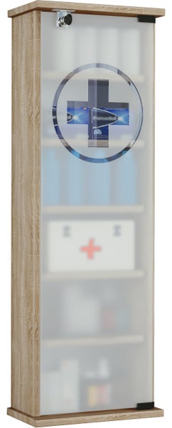 Der Medizinschrank Gusal von VCM besteht aus einer Holzstruktur-Nachbildung mit einer eleganten ESG-Sicherheitsglastür, welche durch ein Türschloss auch verriegelt werden kann.