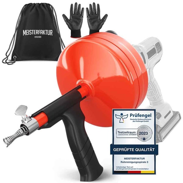 Meisterfaktur Rohrreinigungsspirale mit Metalltrommel [15m] - mit Bohraufsatz - Ideale Abflussspirale für eine Rohrreinigung - Die stabile Rohrspirale für echte Heimwerker!