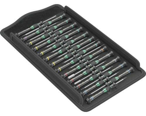 Wera Micro Schraubendreher im Set für feinmechanische Verschraubungen. Durch Abstützen der Hand auf der Drehkappe und durch die Schnelldrehzone unterhalb der Drehkappe ist blitzschnelles Zwirbeln möglich. Zeitintensives Umgreifen entfällt. Aufbewahrung und Transport in robuster Tasche, so ist das Werkzeug immer zur Hand. Mit Werkzeugfinder Take it easy: Farbkennzeichnung nach Profilen und Größenstempelung.