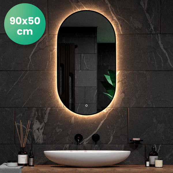 Mirlux Badezimmerspiegel mit LED-Beleuchtung & Heizung, Wandspiegel oval, Anti-Kondensations-Duschspiegel, schwarz, 90x50CM