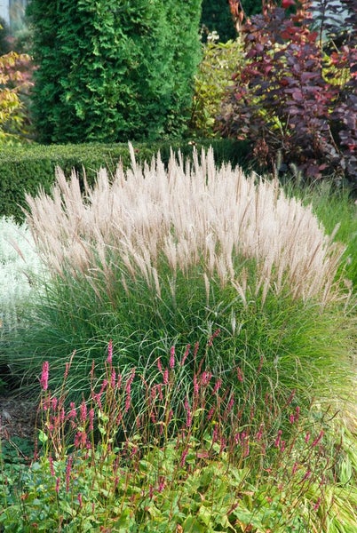 Miscanthus sinensis ‘Sarabande’, das Chinaschilf oder Japangras, ist ein elegantes Ziergras, das als robuste Gartenstaude und ausdrucksstarker Zierstrauch-Ersatz gleichermaßen überzeugt. Mit schmalen, frischgrünen Blättern und feinen, leicht überhängenden Halmen zeigt dieser Gartenstrauch eine aufrechte, dichte Wuchsform, die im Spätsommer von silbrig-rosé bis cremefarben schimmernden Blütenrispen gekrönt wird. Die dekorativen Wedel stehen lange über dem Laub und sorgen bis in den Winter hinein für Struktur, während sich das Blattwerk im Herbst warm gelb bis kupferfarben verfärbt. ‘Sarabande’ erreicht je nach Standortbedingungen etwa 120 bis 160 cm Höhe inklusive Blüten und bildet harmonische Horste ohne Ausläufer. Ideal als Solitär im Staudenbeet, in der Rabatte oder im Vorgarten, ebenso wirkungsvoll in Gruppenpflanzung mit Spätsommerstauden, in der Präriebepflanzung oder als lockere Heckenpflanze mit transparentem Sichtschutzcharakter. In großzügigen Gefäßen lässt sich das Ziergras auch als Kübelpflanze auf Terrasse oder Balkon inszenieren. Bevorzugt werden sonnige Plätze mit durchlässigem, humosem bis sandig-lehmigem Boden, der frisch bis mäßig trocken sein darf; Staunässe sollte vermieden werden. Ein Rückschnitt der vertrockneten Halme erst im späten Winter fördert den Neuaustrieb und erhält den winterlichen Zierwert. Etwas Startdüngung im Frühjahr und gelegentliches Wässern in längeren Trockenphasen genügen, um die Vitalität und die standfeste, aufrechte Silhouette dieser pflegeleichten Miscanthus-Sorte dauerhaft zu unterstützen.