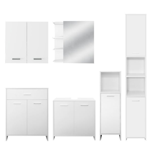 ML-Design Badmöbel-Set 6-teilig Badezimmermöbel Set Badmöbel Komplettset Spiegelschrank Waschtisch mit Unterschrank Hochschrank Badezimmerschrank Hängeschrank Wäscheschrank, Weiß, Holz, viel Stauraum
