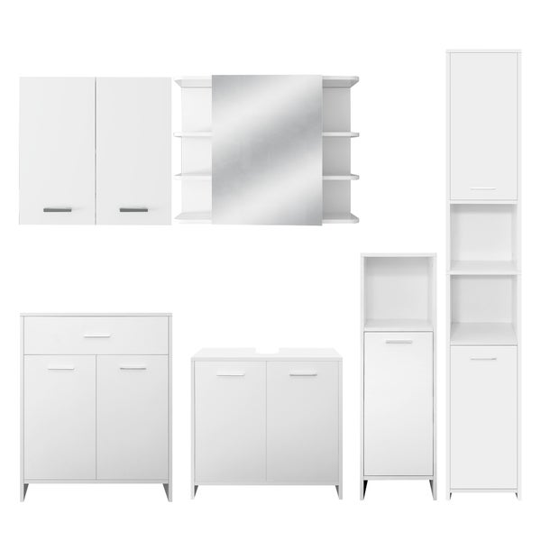 ML-Design Badmöbel-Set 6-teilig Badezimmermöbel Set Badmöbel Komplettset Spiegelschrank Waschtisch mit Unterschrank Hochschrank Badezimmerschrank Hängeschrank Wäscheschrank, Weiß, Holz, viel Stauraum
