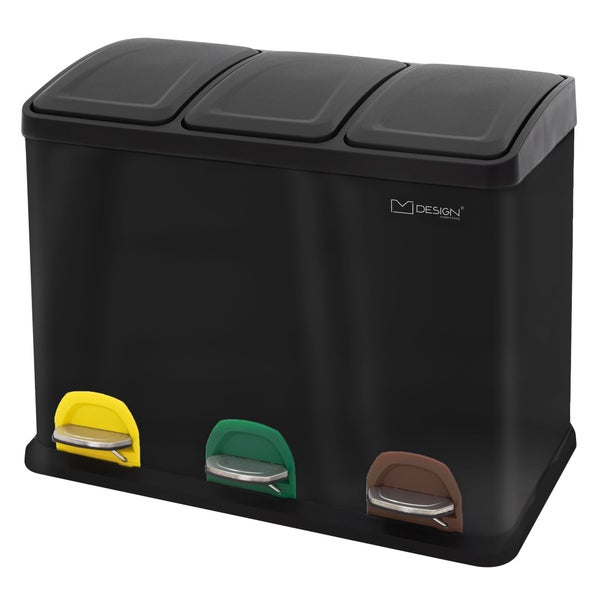 ML-Design Mülleimer Küche 3x 15L (45L), Schwarz, Mülltrennsystem 3 Fächer, Treteimer zur Mülltrennung, Abfalleimer aus Stahl mit Inneneimer aus Kunststoff & Klappdeckel, farblicher Kennzeichnung