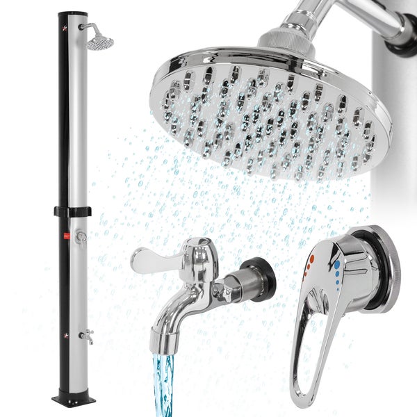 ML-Design Solardusche 35L 217,5cm rund mit Fußdusche und Regenduschkopf Silber-Schwarz, warmes Wasser, 60°C ohne Stromanschluss, mit Gartenschlauch-Anschluss, Solar Gartendusche Außendusche Pooldusche