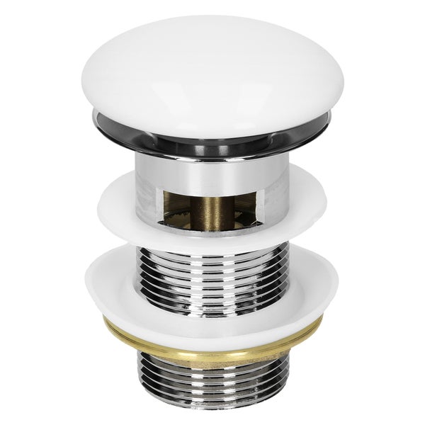 - BeschreibungProduktbeschreibung:Das Ablaufventil von LuxeBath kannst du mit nur einem Fingerdruck auf die Abdeckung öffnen und schließen. Diese sogenannte Push-Open-Technologie ist entwickelt worden um das Waschbecken möglich schnell und einfach verdichten zu können. Die Ablaufgarnitur lässt sich ganz einfach in jedes Waschbecken einsetzen und ist sofort einsatzbereit. Die Einheitsgröße sorgt dafür, dass du die Ablaufgarnitur ganz einfach mit einem Waschbecken deiner Wahl kombinieren kannst. Der Stopfen lässt sich einfach Herausdrehen und macht die Reinigung ganz unkompliziert.Einfache Installation.1. Setzen Sie die obere Unterlegscheibe auf das Ablaufloch der Spüle.2. Legen Sie den Hauptkörper in das Waschbecken.3. Platzieren Sie die untere Unterlegscheibe auf dem Gewindeteil.4. Ziehen Sie das Verriegelungsteil fest.Hinweis: Geeignet für Waschbecken mit Überlauf!Eigenschaften:Installation ohne WerkzeugUniversell für fast alle Waschtische geeignetHochwertige Keramik und hochwertiger EdelstahlAblaufgarnitur für Waschbecken mit ÜberlaufPush-Open-Technologie für komfortable BedienungLieferumfang:1 x Ablaufgarnitur für Waschbecken mit ÜberlaufTechnische Daten:Farbe: Weiß, mattGewicht: ca. 0,25 kgMaterial: Keramik, EdelstahlDurchmesser Keramikkopf: ca. 70 mmDurchmesser Ablauf: Standard Einbaumaß 1 1/4 Zoll (41,2 mm) AußengewindeHöhe: ca. 109 mmHinweis: Die weiße Keramik-Abdeckung kann um einige Millimeter variieren, dies ist eine Besonderheit in der Herstellung der Keramik verursacht durch die Luftfeuchtigkeit und die Ofentemperatur. Dennoch wird sich die variierende Größe weder auf die Funktionalität oder auf die Funktionsweise der Ablaufgarnitur auswirken.