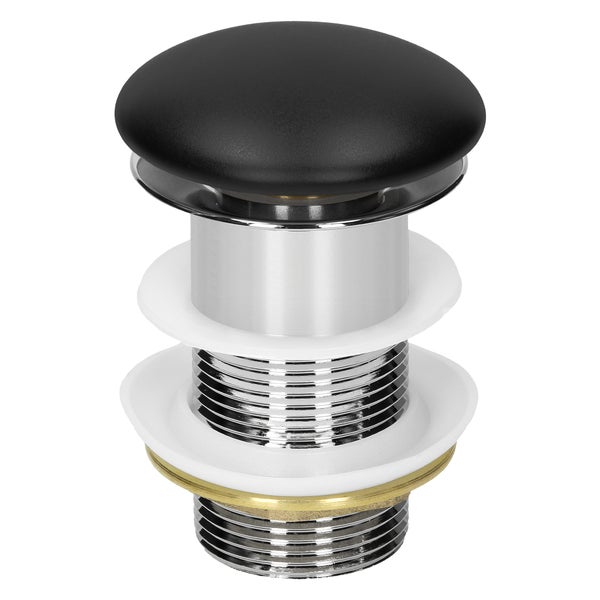 - BeschreibungProduktbeschreibung:Das Ablaufventil von LuxeBath kannst du mit nur einem Fingerdruck auf die Abdeckung öffnen und schließen. Diese sogenannte Push-Open-Technologie ist entwickelt worden um das Waschbecken möglich schnell und einfach verdichten zu können.Die Ablaufgarnitur lässt sich ganz einfach in jedes Waschbecken einsetzen und ist sofort einsatzbereit. Die Einheitsgröße sorgt dafür, dass du die Ablaufgarnitur ganz einfach mit einem Waschbecken deiner Wahl kombinieren kannst. Waschbecken erhältst du ebenfalls bei uns im Online-Shop. Der Stopfen lässt sich einfach Herausdrehen und macht die Reinigung ganz unkompliziert.Hinweis: Geeignet für Waschbecken ohne Überlauf!Eigenschaften:Installation ohne WerkzeugUniversell für fast alle Waschtische geeignetHochwertige Keramik und hochwertiger EdelstahlAblaufgarnitur für Waschbecken ohne ÜberlaufPush-Open-Technologie für komfortable BedienungLieferumfang:1x Ablaufgarnitur für Waschbecken ohne ÜberlaufTechnische Daten:Farbe: Schwarz, mattGewicht: ca. 0,25 kgMaterial: Keramik, EdelstahlDurchmesser Keramikkopf: ca. 70 mmDurchmesser Ablauf: Standard Einbaumaß 1 1/4 Zoll (41,2 mm) AußengewindeHöhe: ca. 109 mmHinweis: Die schwarze Keramik-Abdeckung kann um einige Millimeter variieren, dies ist eine Besonderheit in der Herstellung der Keramik verursacht durch die Luftfeuchtigkeit und die Ofentemperatur. Dennoch wird sich die variierende Größe weder auf die Funktionalität oder auf die Funktionsweise der Ablaufgarnitur auswirken.