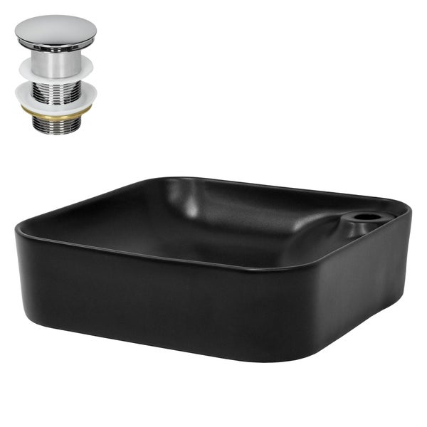 - BeschreibungProduktbeschreibung:Dieses hochwertige Keramik Waschbecken mit Ablaufgarnitur von ML-Design wertet mit seiner modernen Gestaltung jedes Badezimmer oder Gäste-WC auf.Das minimalistische Design mit den abgerundeten Ecken und dem schmalen Rand ist ein echter Blickfang. Es verbindet Modernität und Klarheit mit einem großzügigen und zugleich platzsparenden Waschbereich.Dieses Aufsatzwaschbecken können Sie ganz nach Ihren Vorstellungen auf einem Tisch, einer Platte, auf Bad- oder auch Vintage-Möbeln installieren. Der Ablauf mit Standard-Anschluss ermöglicht es Ihnen, Ihr Waschbecken mit Armatur Ihrer Wahl zu kombinieren und ihm so Ihren ganz eigenen Stil zu verleihen.Die hochwertige Keramik und Glasur vereinfacht Ihnen die Reinigung, das Material ist besonders robust und kratzfest.Das Ablaufventil kannst du mit nur einem Fingerdruck auf die Abdeckung öffnen und schließen. Diese sogenannte Push-Open-Technologie ist entwickelt worden um das Waschbacken möglich schnell und einfach verdichten zu können.Die Ablaufgarnitur lässt sich ganz einfach einsetzen und ist sofort einsatzbereit. Der Stopfen lässt sich einfach Herausdrehen und macht die Reinigung ganz unkompliziert.Eigenschaften:WaschbeckenGröße ca. 430 x 430 x 120 mmHochwertige KeramikArmatur und Ablauf mit DIN AnschlussNutzung als AufsatzwaschbeckenBadkeramik aus einem StückEinfache InstallationAblaufgarniturInstallation ohne WerkzeugUniversell für fast alle Waschtische geeignetVerchromtes MessingAblaufgarnitur für Waschbecken ohne ÜberlaufPush-Open-Technologie für komfortable BedienungLieferumfang:1 x Keramik Waschbecken von ML-Design1 x AblaufgarniturHinweis: Einhebelmischer und Montagematerial sind nicht in der Lieferung enthalten!Technische Details:Farbe: Schwarz, mattMaterial: KeramikMaße (BxTxH): ca. 430 x 430 x 120 mmDurchmesser der Ablaufgarnitur: ca. Ø 45 mmGewicht: ca. 11 kgAblaufgarniturMaterial: MessingDurchmesser: Standard Einbaumaß 1 1/4 Zoll (41,2 mm) AußengewindeFarbe: SilberHöhe: ca. 90 mmGewicht: 230 g
