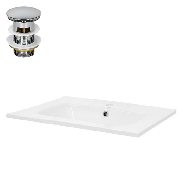 - BeschreibungProduktbeschreibung:WaschbeckenDieses hochwertige Keramik Waschbecken inklusive Ablaufgarnitur mit Überlauf von LuxeBath wertet mit seiner modernen Gestaltung jedes Badezimmer oder Gäste-WC auf. Das Waschbecken eignet sich als ideales Einbauwaschbecken für deine Badezimmer Garnitur.Die Standard-Anschlüsse für Armatur und Ablauf ermöglichen es dir, dein Waschbecken nach deiner Wahl auszustatten und ihm so deinen ganz eigenen Stil zu verleihen.Die hochwertige Keramik und Glasur vereinfacht dir die Reinigung, das Material ist besonders robust und kratzfest.AblaufgarniturDas Ablaufventil können Sie mit nur einem Fingerdruck auf die Abdeckung öffnen und schließen. Die verchromte Garnitur mit ihrem klaren, modernen Design können Sie problemlos mit den unterschiedlichsten Bad-Einrichtungen kombinieren.Der Stopfen lässt sich einfach Herausdrehen und macht die Reinigung ganz unkompliziert.Eigenschaften:WaschbeckenMit HahnlochEinfache InstallationHochwertige KeramikSchönes EinbauwachbeckenBadkeramik aus einem StückInklusive Überlauf und ArmaturenlochStandard-Anschlüsse sorgen für individuelle AnpassungenAblaufgarniturVerchromtes MessingAblaufgarnitur für Waschbecken mit ÜberlaufInstallation ohne WerkzeugPush-Open-Technologie für komfortable BedienungUniversell für fast alle Waschtische geeignetLieferumfang:1 x Einbauwaschbecken1 x Ablaufgarnitur für Waschbecken mit ÜberlaufHinweis: Einhebelmischer und Montagematerial sind nicht in der Lieferung enthalten!Technische Daten:WaschbeckenFarbe: WeißGewicht: ca. 12 kgMaterial: KeramikGröße (BxHxT): ca. 610 x 165 x 460 mmDurchmesser der Ablaufgarnitur: ca. Ø 45 mmAblaufgarnitur Material: MessingDurchmesser: Standard Einbaumaß 1 1/4 Zoll (41,2 mm) AußengewindeFarbe: ChromHöhe: ca. 90 mmGewicht: 230 g