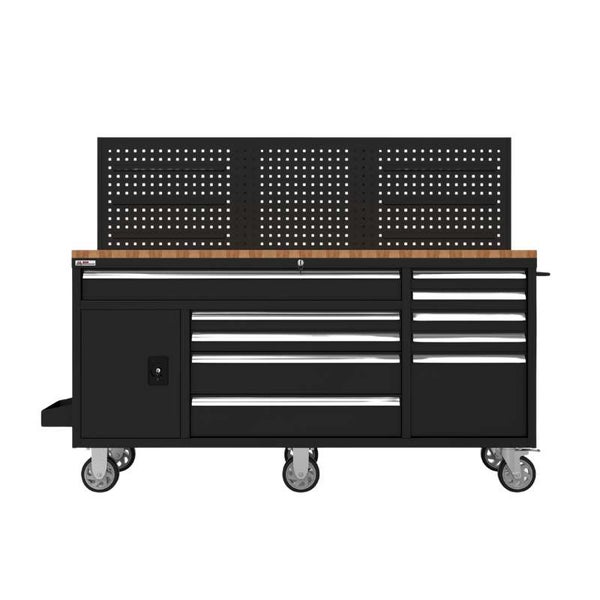 Mit 10 leichtgängigen Schubladen und praktischer Rückwand bietet die robuste Werkbank viel Stauraum für Werkzeuge und Zubehör. Die massive Arbeitsplatte aus Holz sorgt für Stabilität und ausreichend Platz bei allen Arbeiten. Dank der stabilen Rollen ist die Werkbank flexibel einsetzbar und mobil in der Werkstatt nutzbar.