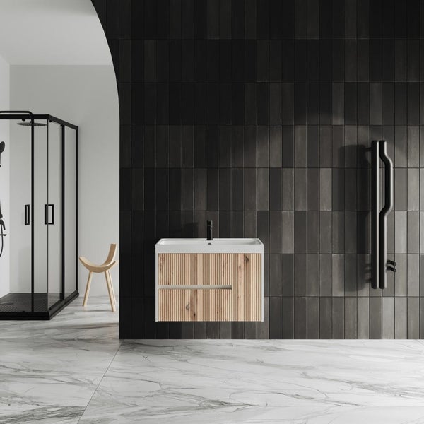 Verwandeln Sie Ihr Badezimmer mit unserem eleganten 80cm hängenden Schrank aus der Cortina Kollektion. Dieser Schrank vereint raffiniertes Design und Funktionalität, um eine luxuriöse Atmosphäre in Ihrem Badezimmer zu schaffen. Die Struktur besteht aus laminierten Holzpaneelen und MDF-Fronten mit einem Rattan-Effekt und ist in mattem Weiß mit passender Eichenfront in Goldoptik veredelt. Diese Konfiguration umfasst 2 Schubladen und 1 Tür und bietet ausreichend Platz zur Organisation Ihrer Badezimmerartikel. Die Schubladen sind mit einer Soft-Close-Funktion ausgestattet, die ein geräuschloses und reibungsloses Öffnen und Schließen gewährleistet. Das Waschbecken aus weißem Harz bietet eine geräumige Wanne und verfügt über Löcher für den Wasserhahn und den Überlauf. Dieser Schrank ist bereits vollständig montiert, was die Installation erheblich vereinfacht. Bitte beachten Sie, dass das Paket keinen Siphon, keinen Waschbeckenhahn oder Schrauben zur Wandbefestigung enthält. Rüsten Sie Ihr Badezimmer mit diesem 80cm Schrank auf und genießen Sie eine elegantere und funktionalere Umgebung.