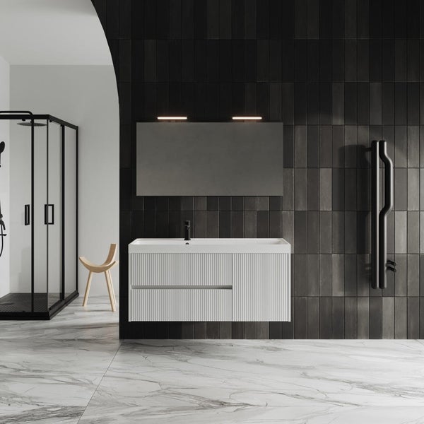 Erneuern Sie Ihr Badezimmer mit unserem 120 cm breiten Badezimmermöbel in eleganter mattweißer Ausführung. Dieses hängende Möbelstück aus der Cortina-Kollektion bietet eine breite und schwebende Basis mit einer Struktur aus veredelten Holzpaneelen, während die Front aus MDF mit Rautenmuster-Effekt besteht und Ihrem Badezimmer ein modernes und raffiniertes Aussehen verleiht. Mit zwei geräumigen und leisen Schubladen mit Soft-Close-Funktion und einer seitlichen Tür bietet das Möbelstück eine makellose Organisation für Ihre Badeartikel. Das Waschbecken aus Harz ist mit einem Loch für den Wasserhahn und einem Überlaufloch ausgestattet, was maximale Funktionalität gewährleistet. Dieses Möbelstück ist bereits komplett montiert und erleichtert somit die Installation erheblich. Bitte beachten Sie jedoch, dass das Set keinen Siphon, Wasserhahn, Spiegelleuchte, Schrauben und Dübel zur Wandbefestigung enthält, die separat erworben werden können. Darüber hinaus vervollständigen ein flacher Spiegel mit den Maßen 120x60 cm und einer Dicke von 2 cm sowie eine Rückwand aus Holz mit ABS-Kante die Komposition und bieten Ihnen ein funktionales und modernes Badezimmer. Machen Sie Ihr Badezimmer zu einem eleganten und organisierten Raum mit diesem hochwertigen Möbelstück.