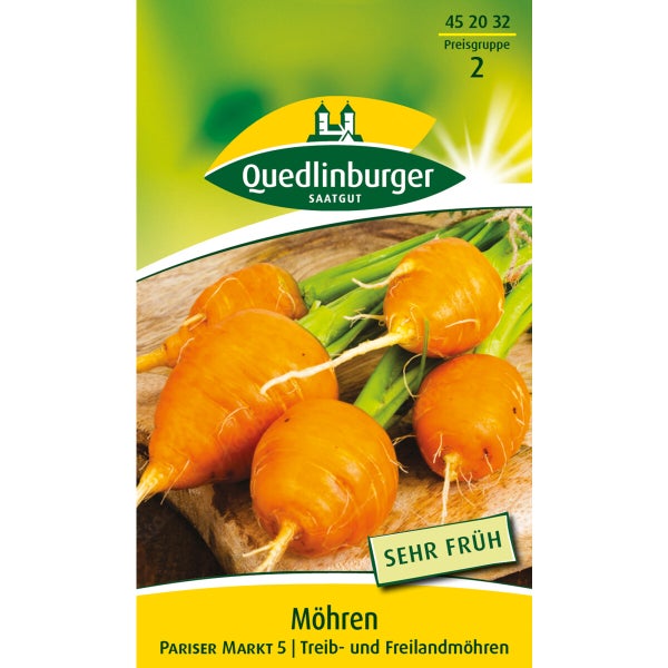 Info: Eine mittelfrühe (ca. 80 Tage) runde Möhre. Ideal für kleine Flächen unter Glas und Folie, sowie für Frühbeet und Balkonkasten. Auf dem Gemüsebeet wächst „Pariser Markt 5„ auf schweren und verdichteten Böden. Geringer Putzaufwand und süßer Geschmack macht sie zur idealen Snackmöhre für Salate und zur Dekoration.Pflege: Aussaat dünn, 0,5 – 1 cm in Reihen mit 20 cm Abstand, mit Erde abdecken und feucht halten. Kräftige Keimlinge mit 4 – 5 Blatt auf 3 – 5 cm Abstand vereinzeln. Liebt sonnigen Standort und humosen, tiefgründigen, steinfreien, sandigen Gartenboden. Hacken und Unkrautkontrolle sind wichtig.Gärtnertipp: Eine Markiersaat mit Radies macht die Reihen sichtbar und ermöglicht Hacken vor dem Auflaufen.Aussaat:März – Juniins FreilandKeimung:14 – 21 Tagebei 10 – 20 °CErnte:Mitte Mai – September