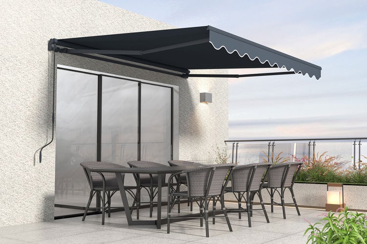 Hergestellt aus pulverbeschichtetem Aluminium, einem Material, das für seine Korrosionsbeständigkeit bekannt ist, gewährleistet die Struktur der Außenjalousien eine zuverlässige Haltbarkeit und erfordert keine besondere Wartung Ihrerseits. Im geöffneten Modus spendet Ihnen die manuelle Markise Schatten, um schöne Sonnentage zu genießen und schafft so einen idealen Entspannungsbereich. Mithilfe der Kurbel können Sie die Jalousie mit einem einfachen Handgriff zusammenklappen, sodass Ihr Außenbereich wieder seine volle Helligkeit erhält. Die Kurbel dieser Markise kann je nach Wunsch rechts oder links positioniert werden.