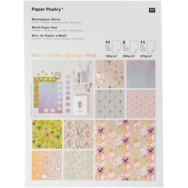 24 Blatt - 11 Blatt 120 g/m² - 2 Blatt 250 g/m² - 11 Blatt 270 g/m²210 x 295 mm.