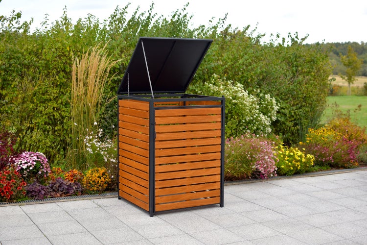 Die Mülltonnenabdeckung besteht aus einem pulverbeschichteten Aluminium/Stahlgestell und geöltem Eukalyptusholz.