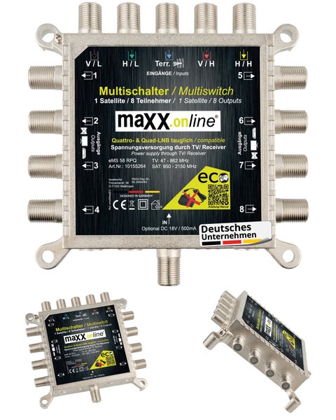 Der maxx.onLine Multischalter eMS 58 RPQ ist ein moderner und kompakter Multischalter für 8 Teilnehmer und einen Satelliten. Der Sat-Multischalter ist flexibel im Eingang: Er kann über ein Quad- oder Quattro-LNB versorgt werden, z.B. Astra, Hotbird, Eutelsat o.Ä. Terrestrische Signale wie DVB-T2, DAB+ oder Kabelfernsehen DVB-C können über den Terr.-Eingang eingespeist werden. Dank modernster Technik wird kein Netzteil benötigt, da der LNB über die angeschlossenen Teilnehmer (Receiver oder Fernseher) mit der notwendigen Spannung versorgt wird.