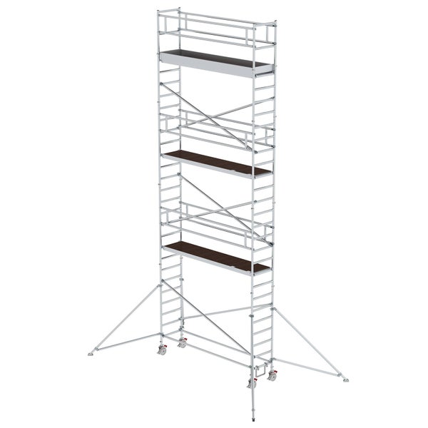 Das ideale Rollgerüst wenn enge Platzverhältnisse herrschen. Die verstellbaren Ausleger schaffen vielerlei Möglichkeiten der Anbringung. Bei ausgeklappten Auslegern steht das Gerüst fest auf jedem Untergrund und garantiert sicheres Arbeiten in großen Höhen. Mit eingeklappten Auslegern lässt es sich problemlos durch Gänge, Türen etc. zum Einsatzort schieben oder für den wandseitigen Aufbau verwenden. Niedriges Gewicht, Steckverbindungen an den Rahmenteilen, Schnellverschlüsse an den Streben, exakter Höhenausgleich durch Spindeln und 4 große Lenkrollen Ø 200 mm mit zentrischer Lasteinleitung stehen für einfache Handhabung. Auch bei diesem Rollgerüst-Typ sind alle Gerüstteile als Ersatz- oder Erweiterungsteil auch einzeln erhältlich. Sie haben die Wahl zwischen 3 Gerüstgrößen: 0,75 x 1,80 m, 0,75 x 2,45 m oder 0,75 x 3,00 m. Technik in der Übersicht: Geprüft DIN EN 1004 Lastklasse/Gerüstgruppe 3, 2,0 kN / m2 Arbeitshöhen bis 12,50 m Gerüstgrößen: 0,75 x 1,80 m / 0,75 x 2,45 m / 0,75 x 3,00 m Aufbau von Plattform zu Plattform im 2,00 m-Abstand Höhenverstellung durch Spindeln Lenkrollen Ø 200 mm Ausleger verstellbar