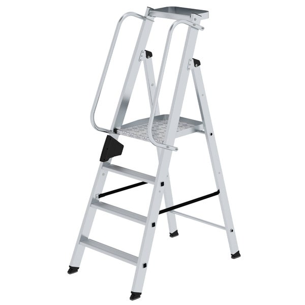 GS-geprüft, entsprechend europäischer Norm DIN EN 131, Betriebssicherheitsverordnung (BetrSichV), TRBS 2121, Handlungsanleitung BGI 694 und geltenden Unfallverhütungsvorschriften Mit großer Standplattform und Ablageschale 80 mm tiefe, geriffelte Stufen Dauerhafte Stufen-Holmverbindung Rutschsichere nivello®-Leiterschuhe und ergo-pad® Griffzone Große Standplattform ca. 400 x 400 mm Ablageschale oben ca. 350 x 200 mm, klappbar Optimiertes Leitern-Gelenk , safe-cap, mit größerer Anlagefläche 3-fach Vernietung und höherer Wandstärke für noch mehr Stabilität und Langlebigkeit der Leiter 2 Handläufe ca. 750 mm lang, zum Selbstanbau (ab Bestell-Nr. 50088, 1300 mm lang) Spreizsicherung mit 2 hochfesten Perlongurten Hohe Standsicherheit durch konische Bauweise Ausführung: Standard