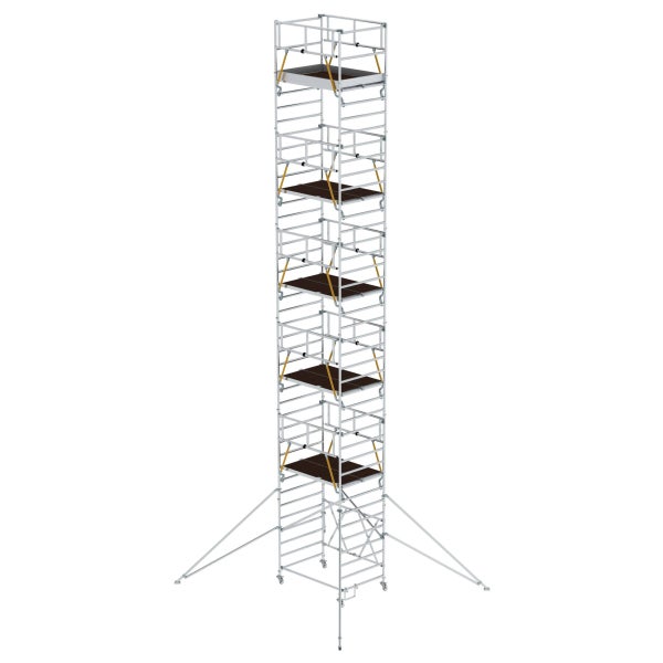 Klappgerüst mit Sicherheitsgeländer und Auslegern von der Munk Günzburger Steigtechnik. Rollgerüst aus stabilem Aluminium-Rundrohr mit geschweißten Rahmenteilen Dank vorlaufenden Geländern rundum gesichert, von Ebene zu Ebene auf- und abbaubar Alle Gerüstteile sind auch einzeln als Ersatz- oder Erweiterungsteile erhältlich Klapprahmen aus Rechteckrohr-Holmen mit selbstarretierenden Scharnieren Stabil und flexibel durch klappbare Ausleger Platzsparend bei Transport und Lagerung Vier Lenkrollen Ø 125 mm mit zentrischer Lasteinleitung, Feststellern und Spindeln ?Trittsichere Plattform für festen Stand Aluminium Bordbretter und Geländerrahmen mit integrierter Knieleiste zur Absturzsicherung (ab Plattformhöhe 2,8 m) Einfacher Auf- und Abbau ohne Werkzeug Technik in der Übersicht Unterschiedliche Plattformbreiten erhältlich (0,75/1,35 m) Plattformlängen 2,45 m und 3,0 m auf Anfrage Arbeitshöhen bis 13,88 m Entspricht DIN EN 1004 Lastklasse/Gerüstgruppe 2: 1,5 kN/m² Hinweis:Die erforderliche Anzahl an Balastgewichten hängt von der Aufbauart, dem Aufbauort und der Gerüsthöhe abDie Aufbau- und Gebrauchsanleitung gibt Ihnen dazu ausführliche Informationen *=Ausleger nicht im Standardumfang enthalten bei Art.-Nr. 115114, 115201, 115124, 115224, und 115234.