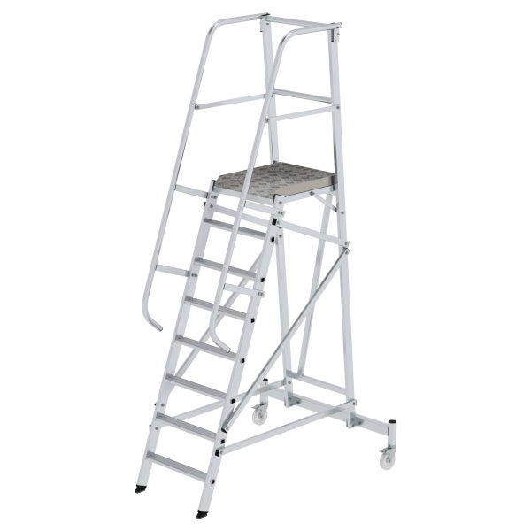 GS-geprüft, entsprechend europäischer Norm DIN EN 131, Betriebssicherheitsverordnung (BetrSichV), TRBS 2121, Handlungsanleitung BGI 694 und geltenden Unfallverhütungsvorschriften. Mit großer Standplattform Einseitig begehbar 80 mm tiefe, geriffelte Stufen ,mit dauerhafter Stufen-Holmverbindung Rutschsichere nivello® -Leiterschuhe Mit 2 Bockrollen Durchmesser 125 mm mit Feststeller 2 Handläufe und Geländer mit Knieleiste Große Rutschfeste Arbeitsplattform ca 510 x 600 mm mit umlaufender Fußleiste Plattformleiter durch lösbare Diagonalstreben und Horizontalstreben klappbar Für eine platzsparende Aufbewahrung und Transport Stützteil mit stabilisierender Quertraverse für hohe Standsicherheit Stufenabstand 235 mm Leiterneigung 20°