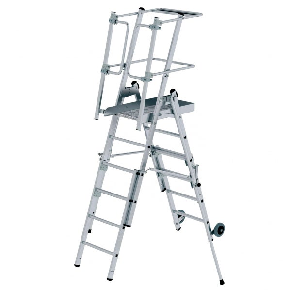 Das Multitalent unter den Plattformleitern: Handlich, sicher, höhenverstellbar, treppengängig und fahrbar! Sie suchen eine Leiter, die handlich ist aber einen sicheren und großflächigen Stand bietet und das noch mit Rundumschutz? FlexxStep ist die Lösung! Die stabile Aluminiumkonstruktion in Industriequalität, bietet gebördelte Sprossen für den sicheren Aufstieg auf die geräumige Plattform. Mit Handlauf, Geländer und Knieleiste für sicheres Begehen und Stehen. Auch bei länger andauernden Arbeiten. Selbst mit Werkzeug und Arbeitsgerät. Die selbstschließende Sicherheitstüre ist ein Sicherheitshighlight und rundet das Gesamtpaket ab. Mit einem flexiblen Teleskopteil ist FlexxStep in wenigen Handgriffen und ohne Werkzeug erweiterbar und damit höhenverstellbar, wie auch treppengängig. Ein anderer Einsatzort ruft? Dank integrierter Rollen und einem praktikablen Klappmechanismus wechselt FlexxStep schnell und flexibel den Standort. Das schafft kein Gerüst. Ausführung nach DIN EN 131-7 und der französischen Norm NFP 93-352/353 Komfortable Standplattform, 480 x 655 mm Selbstschließende Sicherheitstür Geländer mit Handlauf und Knieleiste Plattformhöhe bis 2370 mm Stufenlos verstellbare Ausleger Integrierte Werkzeugablageschale Transport durch Rollen, Ø 150 mm Handlich: Geringe Breite und kleines Packmaß Höhenverstellung: Farbig gekennzeichnete Griffbereiche Teleskopteil ohne Werkzeug montierbar Vierfach gebördelte Sprossenholmverbindung Höhenverstellbar und treppengängig Mit Transportrollen einfach verschiebbar zum nächsten Einsatzort Industriequalität „Made in Germany“ und mit 15 Jahren Qualitätsgarantie