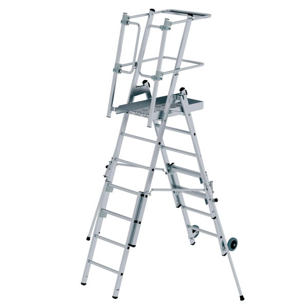 Das Multitalent unter den Plattformleitern: Handlich, sicher, höhenverstellbar, treppengängig und fahrbar! Sie suchen eine Leiter, die handlich ist aber einen sicheren und großflächigen Stand bietet und das noch mit Rundumschutz? FlexxStep ist die Lösung! Die stabile Aluminiumkonstruktion in Industriequalität, bietet gebördelte Sprossen für den sicheren Aufstieg auf die geräumige Plattform. Mit Handlauf, Geländer und Knieleiste für sicheres Begehen und Stehen. Auch bei länger andauernden Arbeiten. Selbst mit Werkzeug und Arbeitsgerät. Die selbstschließende Sicherheitstüre ist ein Sicherheitshighlight und rundet das Gesamtpaket ab. Mit einem flexiblen Teleskopteil ist FlexxStep in wenigen Handgriffen und ohne Werkzeug erweiterbar und damit höhenverstellbar, wie auch treppengängig. Ein anderer Einsatzort ruft? Dank integrierter Rollen und einem praktikablen Klappmechanismus wechselt FlexxStep schnell und flexibel den Standort. Das schafft kein Gerüst. Ausführung nach DIN EN 131-7 und der französischen Norm NFP 93-352/353 Komfortable Standplattform, 480 x 655 mm Selbstschließende Sicherheitstür Geländer mit Handlauf und Knieleiste Plattformhöhe bis 2370 mm Stufenlos verstellbare Ausleger Integrierte Werkzeugablageschale Transport durch Rollen, Ø 150 mm Handlich: Geringe Breite und kleines Packmaß Höhenverstellung: Farbig gekennzeichnete Griffbereiche Teleskopteil ohne Werkzeug montierbar Vierfach gebördelte Sprossenholmverbindung Höhenverstellbar und treppengängig Mit Transportrollen einfach verschiebbar zum nächsten Einsatzort Industriequalität „Made in Germany“ und mit 15 Jahren Qualitätsgarantie