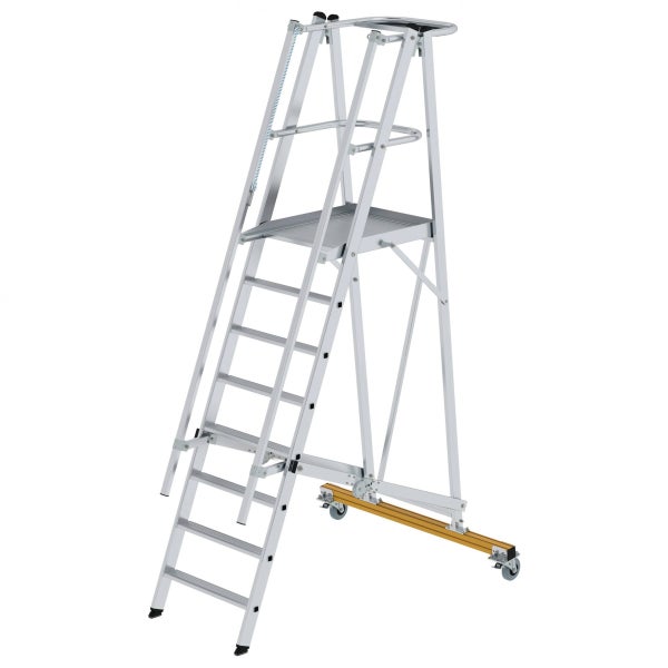GS-geprüft, entsprechend Betriebssicherheitsverordnung (BetrSichV), TRBS 2121, Handlungsanleitung BGI 694 und BGI 637, entsprechend europäischer Norm prEN 131-7 Kräftige Profilholme 80 mm tiefe Geriffelte Stufen Dauerhaft mit den Holmen verbördelt Geräumige Plattform 650 x 600 mm aus geriffeltem Aluminium-Belag Beidseitiger Handlauf Dreiseitiges Plattformgeländer Sicherer Stand durch rutschsichere nivello®-Leiterschuhe und Quertraverse mit zwei feststellbaren Bockrollen Oben mit großer Ablageschale Leiterbreite 650 mm