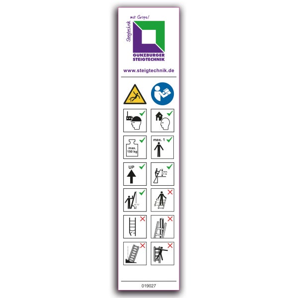 Aufkleber mit Benutzerhinweisen Gemäß DIN EN 131-3 sind produktspezifische Aufkleber mit Benutzerhinweisen anzubringen.