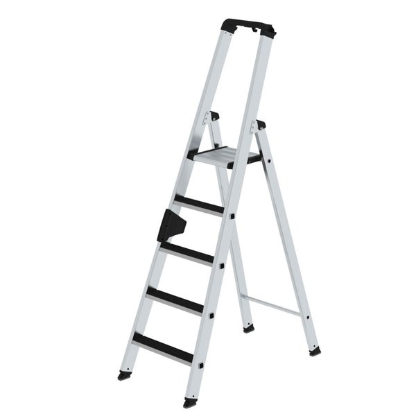 Günzburger Stehleiter mit ergo-pad® 80 mm tiefe, geriffelte Stufen Mit dauerhafter Stufen-Holmverbindung Rutschsichere nivello® -Leiterschuhe Ergo-Pad® Griffzone mit Klemmmechanismus NEU: optimiertes Leitern-Gelenk mit größerer Anlagefläche 3-fach Vernietung und höherer Wandstärke für noch mehr Stabilität und Langlebigkeit der Leiter Das neue ´safe-cap´(geschützt durch Geschmacksmuster Nr. 40 2012 004 55) aus robustem Kunststoff schützt beim Verladen und Aufbewahren der Leiter: Wände, KFZ-Ladeflächen uvm. und das Gelenk selbst Hohe Standsicherheit durch konische Bauweise Ab 7 Stufen Spreizsicherung mit 2 hochfesten Perlongurten Stufenabstand: 235mm Leiterneigung: 20° ergo-pad®Das ergo-pad® ist am optimalen Tragepunkt obiger Leitern angebracht, damit tragen Sie die Leitern automatisch im Schwerpunkt. Die Griffzone ergo-pad® aus weichem Kunststoff ist abrutschsicher und schmiegt sich durch die ergonomische Ausformung in Ihre Hand. Das ergo-pad® erhöht den Tragekomfort und erleichtert das Handling der Leiter. Es ist für Rechts- und Linkshänder gleichermaßen geeignet. Weiterer Pluspunkt: Der integrierte Klemmmechanismus sichert die Holme der Leiter im zusammengeklappten Zustand. Er arretiert diese - ohne zusätzlichen Handgriff - und erleichtert damit das Tragen der Leiter. Einfach praktisch - mit Grips. Das ergo-pad® ist temperaturbeständig von -40 bis +60 °C und ist serienmäßiges Produktbestandteil ohne Mehrpreis.