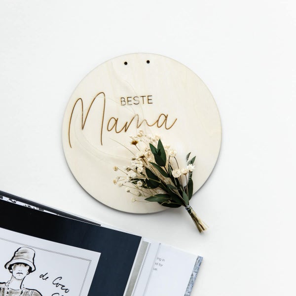 Wenn du noch auf der Suche nach einer passenden Geschenkidee zum Muttertag bist, könnte eine runde Holzscheibe mit der Aufschrift Beste Mama und Trockenblumenverzierung eine gute Wahl sein.