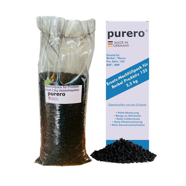 *mit dem berbel Umluftfilter | Hybridfilter **Da die Downline Compact/Performance/Infinity mit zwei Filtern ausgestattet ist, benötigen Sie zwei 5kg für einen Kohlewechsel *** Bis Mitte 2015 wurden die Inselhauben Skyline und Skyline Edge mit zwei eingebauten Umluftfiltern produziert. In diesem Fall sind 5kg Aktivkohle notwendig. Sollten Sie Ihren Skyline Dunstabzug in 2015 erworben haben, überprüfen Sie bitte vor Ihrer Bestellung, ob Sie eine Skyline/Skyline Edge mit zwei Umluftfiltern besitzen, erkennbar ist dies von oben durch je ein Lüftungsgitter auf der linken und rechten Seite. Austauschbar -der Umwelt zuliebe! Mit den praktischen Nachfüllpacks zeigt Purero, dass moderne Küchentechnik und effektiver Umweltschutz sehr gut vereinbar sind. Die Aktivkohle der Umluftfilter kann einfach und kostengünstig ausgetauscht werden. Das schont die Haushaltskasse und die Umwelt. berbel - bewusst pro Natur! Nachfüllpack Aktivkohle aus Kokosnussschale Die Lebensdauer der Purero Aktivkohle ProAktiv liegt bei ca. 2-3 Jahre je nach Kochverhalten. Danach empfiehlt sich ein Austausch, der dank durchdachtem Konzept ebenso einfach wie genial funktioniert: Die alte Aktivkohle wird getauscht, das Gehäuse bleibt erhalten. Echt praktisch! Wer nach dem Kochen die automatische Nachlauffunktion nutzt, kann die Lebensdauer der Aktivkohle noch weiter optimieren.Geeignet für folgende Geräte