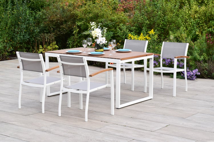 Der Stapelsessel ist mit Armlehnen aus geölten Akazienholz ausgestattet, die nicht nur für einen angenehmen Sitzkomfort sorgen, sondern auch optisch überzeugen. Das pulverbeschichtete Aluminiumgestell in elegantem Weiß garantiert ist ein optisches Highlight, während die Textilbespannung in zeitlosem Grau mühelos zur Ihrer bestehenden Gartengestaltung passt. Dank der cleveren Stapelfunktion lassen sich die Sessel ganz einfach verstauen, wenn sie nicht gebraucht werden.