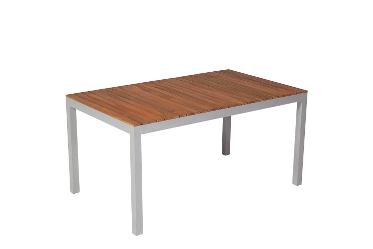 Der Tisch ist aus einem pulverbeschichteten Aluminiumgestell und einer Tischplatte aus geölten Akazienholz gefertigt.